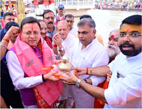 On the occasion of completing four successful years as the Chief Servant of the state, Chief Minister Pushkar Singh Dhami performed a traditional worship of Mother Ganga at Brahmakund, Har Ki Pauri in Haridwar, praying for the prosperity, peace, and progress of the state. He also prayed to Mother Ganga to fulfill the wishes of all devotees visiting Haridwar.